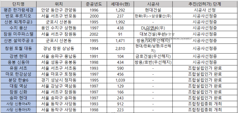이에 조합설립 즈음의 단지들까지를 기준으로 추진현황을 정리해 보았습니다.