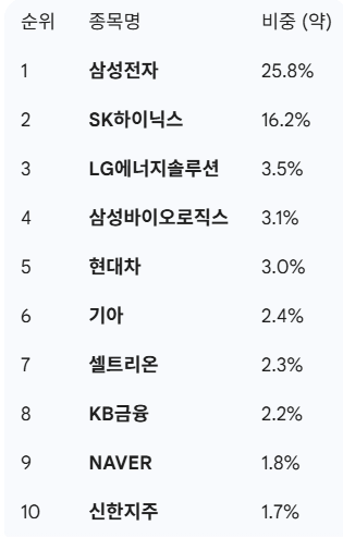 - 삼성전자와 SK하이닉스 국내를 대표하는 두 기업이 약 40%에 달하며 치중된 모습을 보이기도 합니다.