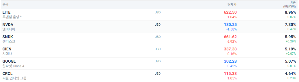 ㅁ가장 높은 비중을 차지하고 있는 종목은 루멘텀 홀딩스입니다. 그 밖에도 최근 레거시 반도체 품귀현상으로 크게 주가가 상승한 샌디스크(SNDK)와 마이크론테크놀로지(MU)가 뒤를 잇고 있습니다.