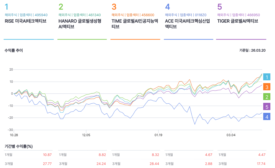 | TIGER 글로벌AI액티브 | 466950 | 글로벌 AI 밸류체인 전반에 투자 | +4.47% / +17.74% |