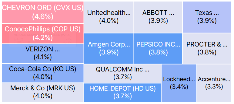 - 미국에 상장된 기업 중 10년 이상 연속 배당을 실시한 기록이 있으며 현금흐름 등 재무 건전성과 펀더멘탈이 우수한 100개 종목으로 구성되어 있습니다.